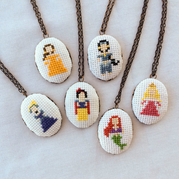 Please send help — I’m deeply in love with these Disney Princess cross stitch necklaces by SynapsetoSynapse. I’m about to buy them all… so if the link to the listing no longer works, now you know why.